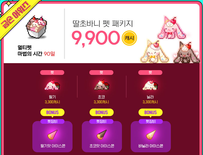 펫 장비 : 딸기맛 아이스콘, 초코맛 아이스콘, 바닐라 아이스콘